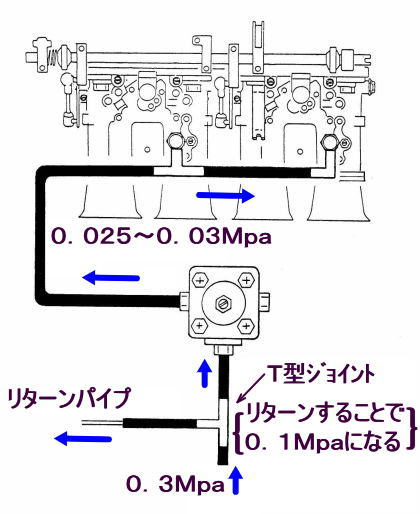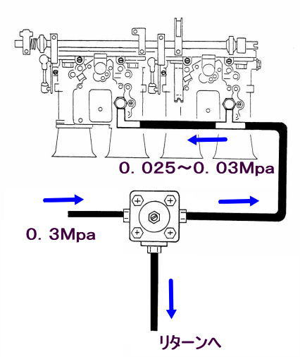 (LO)0.1MPaの燃圧を0.025〜0.03MPa(0.25〜0.3kg/cm2)にさげます。