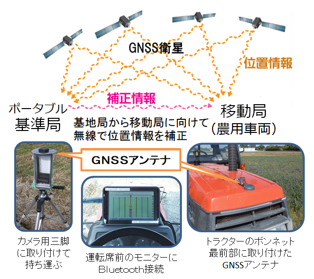 - 地上に「基地局」を設置して補正信号を発信する「RTK方式」で、位置情報の誤差を3センチまで縮小
